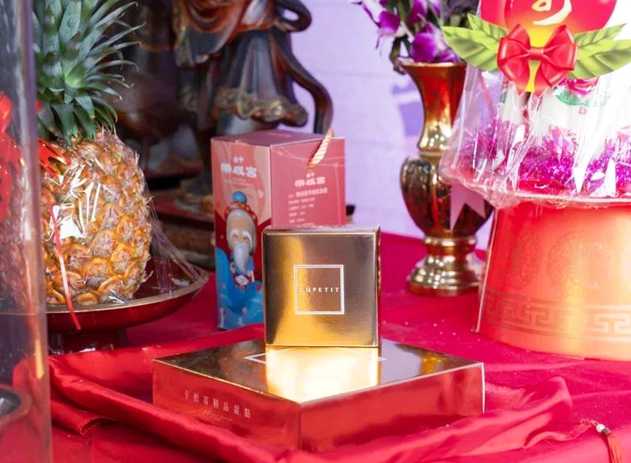 卡柏蒂品牌總監說,這次十分榮幸能與台中樂成宮合作,CUPETIT卡柏蒂為台灣精品甜點品牌,以法式甜點為基底,融合土地風味與設計精神,獲多項國內外大獎肯定。首創「柏金提袋與金磚禮」,因為有月老加持,意外爆紅,許多新人特地從南部北上,只為購得這款月老加持的金色祝福,更成為宴客最佳祝福禮。