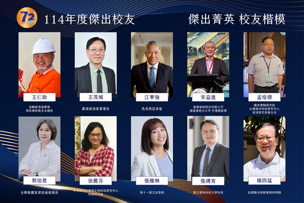本次10位新科傑出校友分別為退輔會清境農場王仁助場長(81級水產食品科學系)、農業部漁業署王茂城署長(78級環境生物與漁業科學學系/80級漁業科學學系碩士)、馬來西亞拿督江華強(74級輪機工程系)、臺灣港務股份有限公司基隆港務分公司宋益進代理總經理(91級航運管理系碩士)、國家實驗研究院台灣海洋科技研究中心孟培傑主任(72級海洋系) 、全興集團郭怡君首席技術發展長(79級水產養殖學系/81級水產養殖學系碩士)、中央研究院農業生物科技研究中心徐麗芬特聘研究員(73級水產食品科學系/75級水產食品科學系碩士)、張雅琳立法委員(91級航運管理學系)、國立雲林科技大學張傳育校長(82級航海技術系/84級電機工程研究所碩士)及詮德聯合律師事務所楊四猛律師(92級海洋法律研究所碩士)。