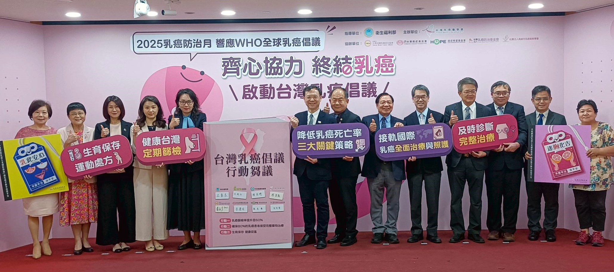 會中並提出3大具體行動目標包括,提升健康意識與篩檢成效,篩檢率從現行40%提升至60%;確保早期診斷與完整治:80%早期乳癌患者接受完整藥物治療;落實醫療平權與癌友支持,建立全面性支持系統,確保患者都能獲得優質照護。