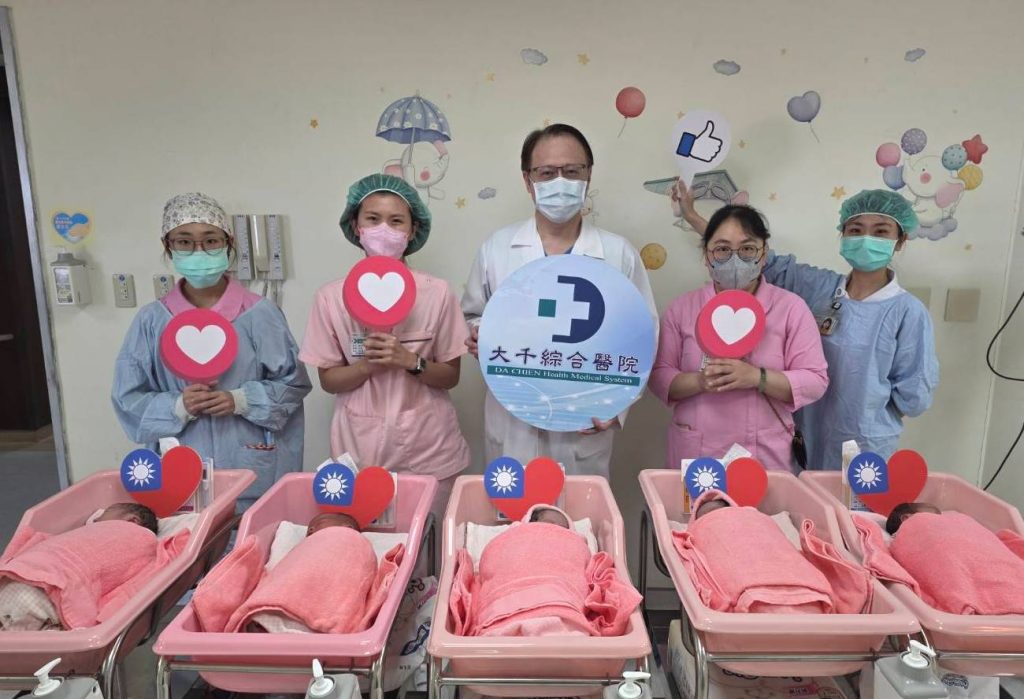 熱鬧的雙十國慶,苗栗大千綜合醫院在10日早上也歡喜迎接5位國慶寶寶的到來,其中包含2對雙胞胎,為國慶日增添雙倍喜氣;而苗栗為恭紀念醫院產房傳來喜訊,產婦高齡39歲順利誕生一名「國慶男寶寶」,為全院增添節慶喜悅。