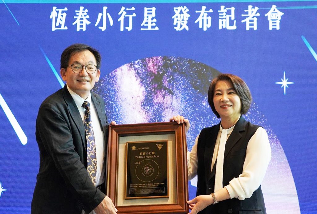 會中由陳文逸致贈「恆春小行星」命名銘版,象徵恆春之名正式被刻入星圖;縣長周春米則回贈由恆春藝術家楊宗熏雕刻的藝術品,更邀恆春民謠藝師獻唱,將星空與文化融合。