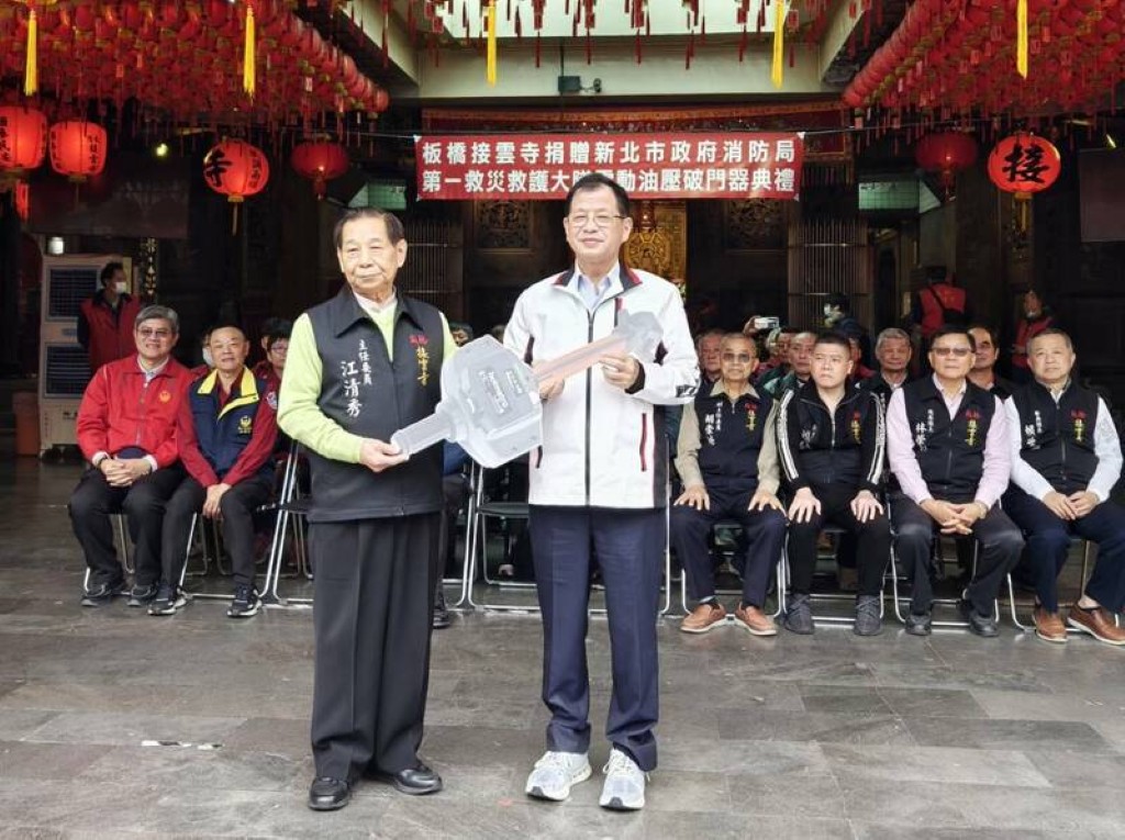 新北市板橋接雲寺今天開會,全數通過捐贈三百萬元,挹注光復鄉重災區災後復原;圖為接雲寺主委江清秀(左),今年初捐贈200餘萬元的電動破門器給新北市消防局,局長陳崇岳(右)代表受贈。(記者翻攝)