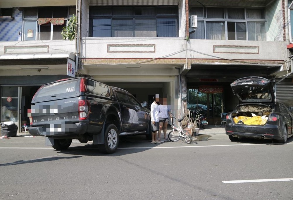 中埔分局表示,十月十日下午,李男開車沿台十八線西往東方向行駛,行經事故路段時,遭蔡女駕駛的自小客從後方不明原因碰撞,因反應不及,兩車都失控滑行至對向車道的民宅前,一間宮廟鐵捲門因此被撞壞。