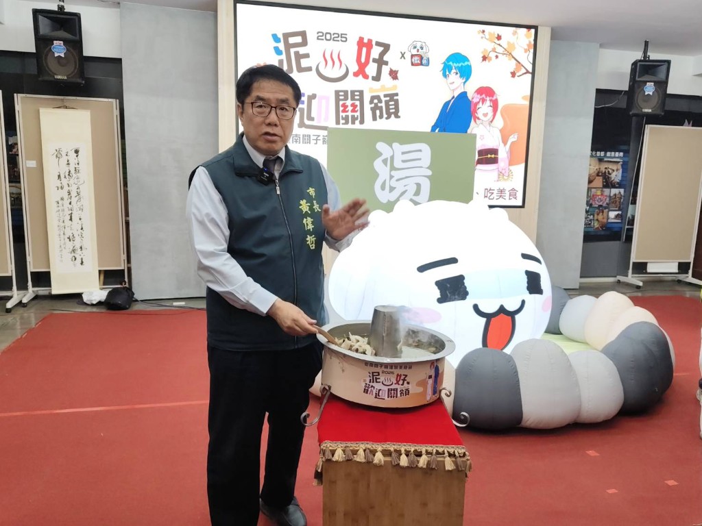 2025台南關子嶺溫泉美食節二十五日開幕,市長黃偉哲(左五)和觀旅局長林國華(左四)等人,為這場秋季台南指標活動行銷。(記者陳佳伶攝)