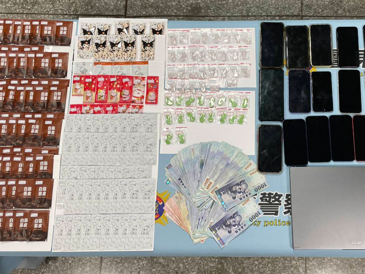 經專案小組四個月追查,警方七月持搜索票,兵分多路在屏東、高雄多處同步攻堅,查獲以徐姓男子為首的八名成員,起出愷他命七十公克、毒品咖啡包七百公克,以及葡萄錠、哈密瓜錠等新興毒品約一二六公克。