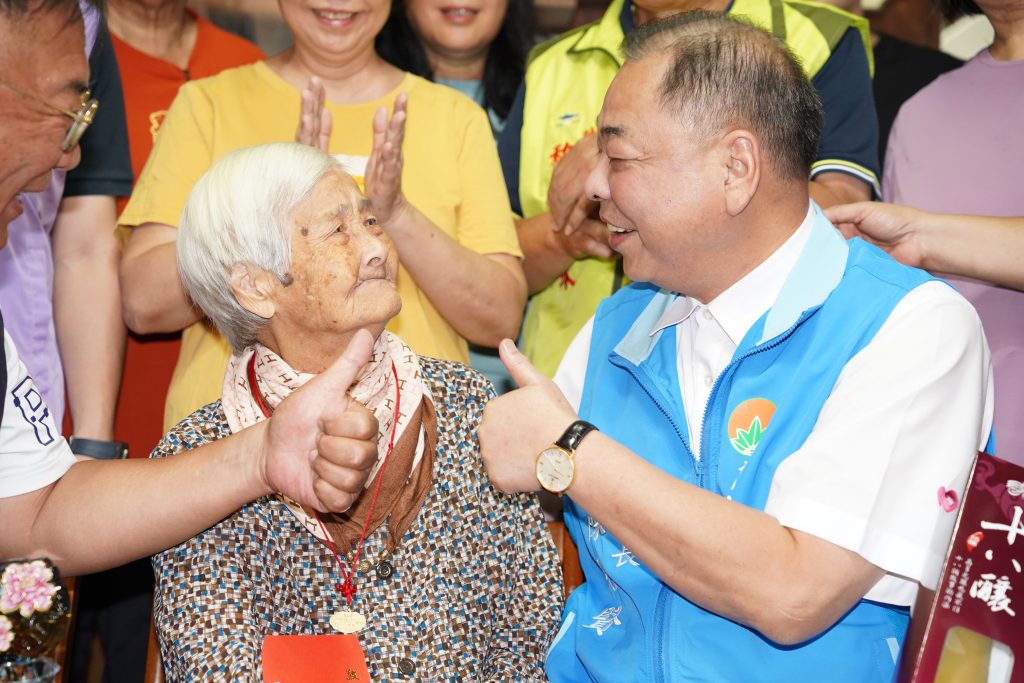 竹北年紀最長一0二歲的呂范端妹,常常在家附近散步,不挑食,耳聰目明,與副縣長互動熱絡,細數過去受獎經歷,可愛模樣逗得大家歡笑連連。
