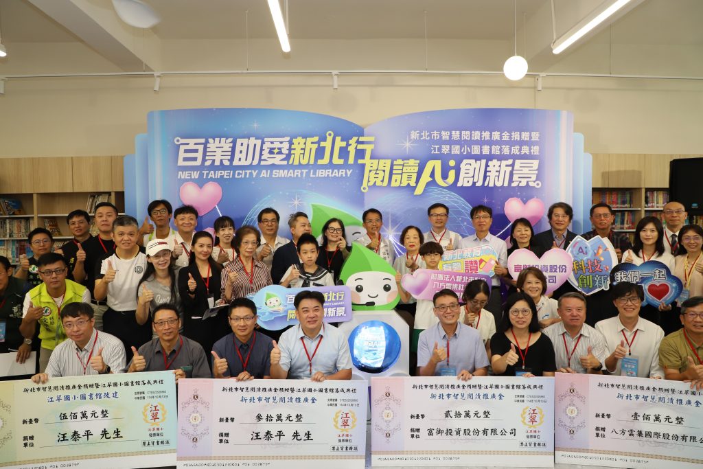 閱讀力就是未來力!新北市教育局十三日於板橋區江翠國小舉辦「百業助愛新北行 閱讀AI創新景-新北市智慧閱讀推廣金捐贈暨江翠國小圖書館啟用典禮」,由八方雲集國際股份有限公司、富御投資股份有限公司與汪泰平共同捐贈江翠國小及新北市十五所高中、國中、小學閱讀推廣金共六百五十萬元。在新北市秘書長邱敬斌的見證下,公私協力打造結合AI與數位科技的智慧圖書館,讓孩子開啟閱讀新視野。