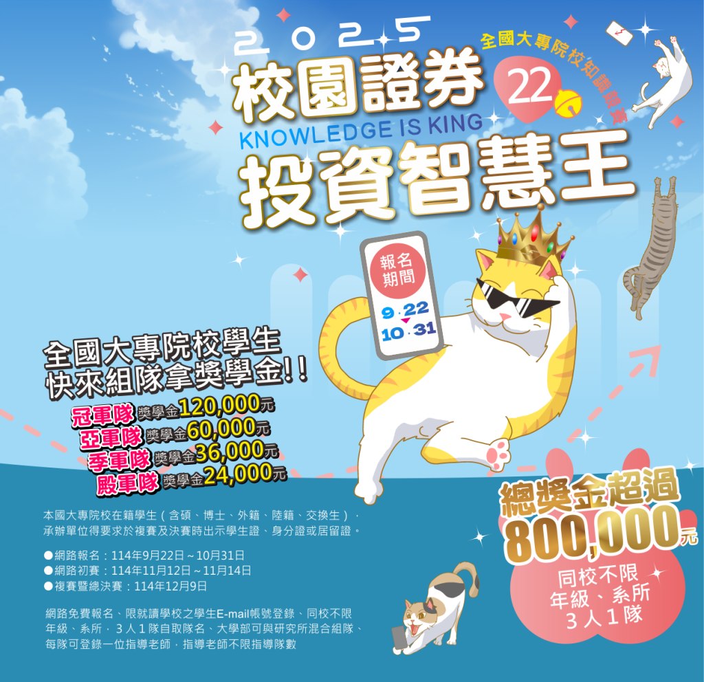 為持續推廣投資人教育,臺灣證券交易所為全國大專院校學生量身訂做的證券投資知識競賽活動「校園證券投資智慧王」,已開放報名,本次總決賽冠軍隊伍獎金高達12萬元,總獎金超過80萬元,歡迎各大專院校學生踴躍組隊報名,報名不限財金系所喔!