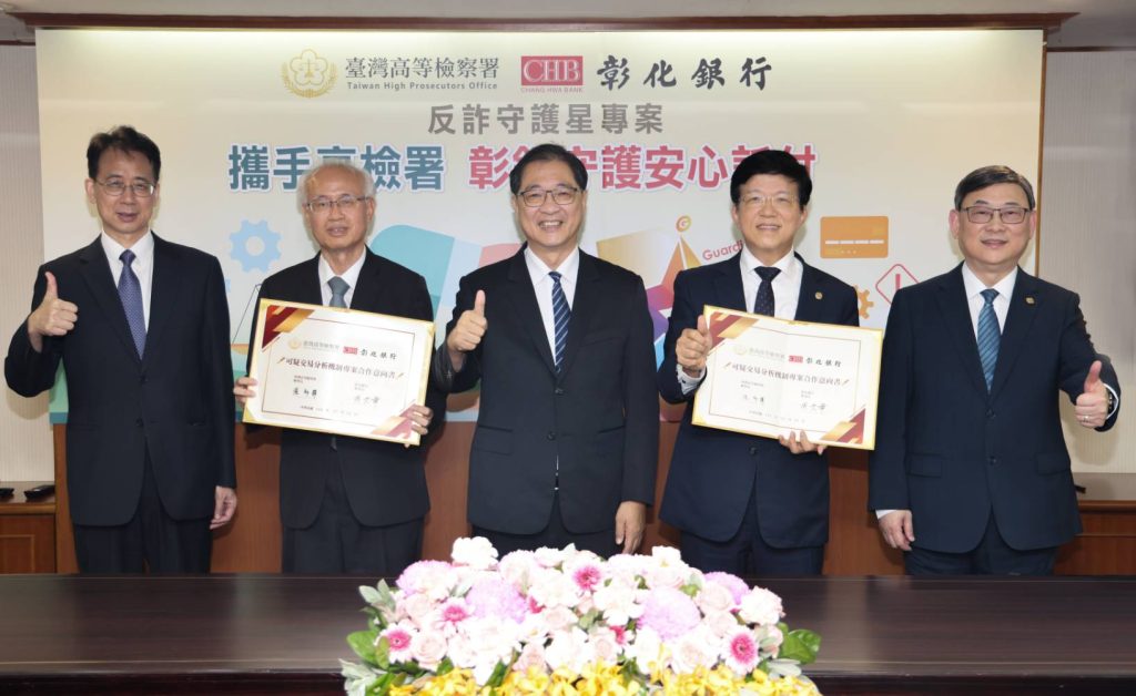 彰化銀行繼今年3月與刑事警察局簽署「反詐騙專案合作意向書」,強化與警方情資分享、異常交易通報、教育訓練及識詐宣導資源互助等協力機制後,13日在法務部部長鄭銘謙見證下,再與臺灣高等檢察署簽署「可疑交易分析機制」專案合作意向書(MOU),由彰化銀行董事長胡光華與臺灣高等檢察署檢察長張斗輝共同代表簽署,彰化銀行總經理簡志光、獨立董事吳雨學、金融監督管理委員會銀行局副局長張嘉魁、臺北地檢署檢察長王俊力、新北地檢署檢察長郭永發、士林地檢署檢察長張云綺皆到場見證。