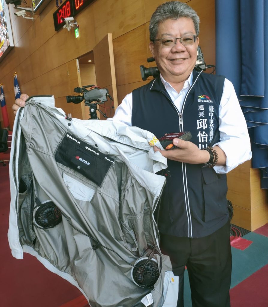 包括台中市議員陳成添及林昊佑等人均關心極端氣侯造成熱傷害的問題,建議台中市府研議編列農民、戶外勞工及民間企業購買風扇衣之補助,目前台中市勞工局勞檢處已率先採購十件風扇衣給勞檢稽查員使用,也協助中央勞動部推廣風扇衣補助。