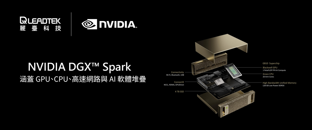 NVIDIA 推出創始版個人超級電腦 NVIDIA DGX Spark,由麗臺科技代理引進台灣。其高效能、低成本且易於使用,搭載 NVIDIA Grace Blackwell 超級晶片與 NVIDIA AI 軟體堆疊,賦能研究人員、數據科學家及開發者進行 AI 模型訓練和推論,加速 AI 創新。