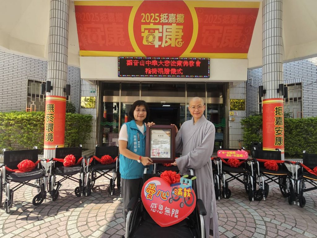 為關懷偏鄉地區行動不便民眾,觀音山中華大悲法藏佛教會於今(14)日慷慨捐贈嘉義縣各衛生所共10台全新輪椅,提供第一線公共衛生人員使用,嘉惠長者及行動不便者。捐贈儀式於嘉義縣衛生局舉行,由佛教會代表釋大善法師出席,衛生局長趙紋華代表受贈,象徵宗教團體以實際行動落實「以慈悲為本、以行願為實」的理念。
