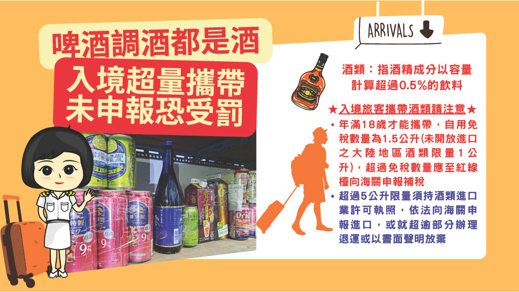 基隆關表示,民眾常誤以為包裝標示為「低酒精」或「調酒」等飲品不屬於「酒類」,所以越來越多旅客返國時會攜帶啤酒、梅酒、沙瓦等含酒精飲料入境,導致超量攜帶未申報遭海關查獲後裁處。依據菸酒管理法第4條規定,含酒精成分以容量計算超過0.5%的飲料屬於「酒類」,民眾在攜帶含酒精成分飲料入境前,應先確認酒精濃度、免稅及限量規定,避免超量攜帶未依規定申報受罰。