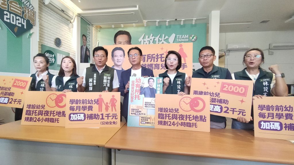 林俊憲在議員蔡麗青、黃肇輝、郭鴻儀、林依婷、余柷青、沈家鳳等人陪同下,推出托育政策藍圖,祭出三支箭,包括零至二歲托嬰保母補助每月加碼兩千元、二至六歲幼兒學費補助一千元及全市三十七區增設臨托和夜托服務。