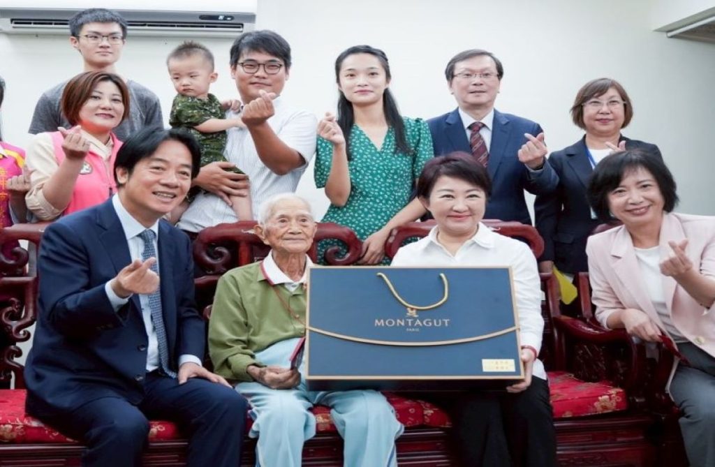 總統賴清德十四日在台中市長盧秀燕陪同下,拜訪陳活森阿公及洪李英嬌阿嬤兩位百歲人瑞,致贈總統府及衛福部聯名的金鎖片,賴清德並親自為他們掛戴金鎖片,祝福長輩福壽延年、身體健康。