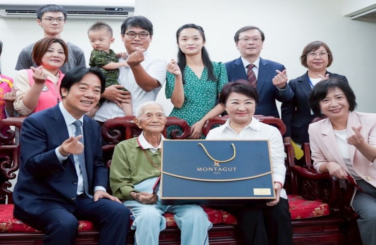 賴清德總統至台中拜訪百歲人瑞陳活森,台中市長盧秀燕、立委何欣純也同行。(記者楊文琳攝)