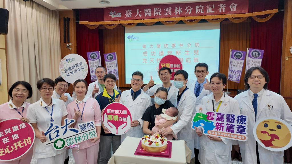 台大醫院雲林分院成功搶救一名體重二千七百多克,產檢無異常,出生後出現喘嗚與呼吸費力患有先天性橫膈膜疝氣,經緊急手術及住觀察兩週後順利康復出院。十五日康復兩個月大男嬰在媽媽懷中亮相分享這珍貴的醫療成果與團隊合作精神,並和醫療團隊一起切蛋糕,象徵「生命重生與希望延續」。