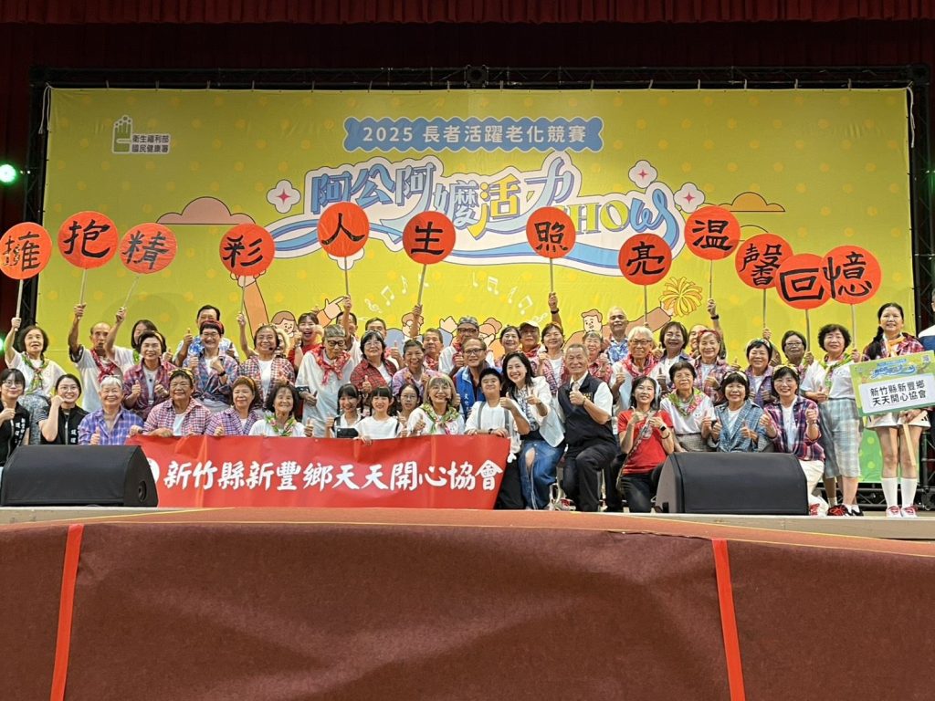 「新豐鄉天天開心協會」這次參加全國競賽,以「時光裡的我們」為主軸,帶著觀眾搭乘「時光列車」回到半世紀前生活樸實艱辛的年代,那時的孩子因阿公布袋戲與講古享有純真童趣。演出接著進入三十年前,經濟起飛、思想開放,婆媽們參加土風舞班,長輩組團出國旅遊,一直到現在,每位長者都是「時光裡的那顆星」,讓生命之光持續璀璨,他們也更加珍惜幸福與健康。「新豐鄉天天開心協會」不管在身體活動力、團隊合作,都表現的很精彩的演出,贏得評審一致的肯定。