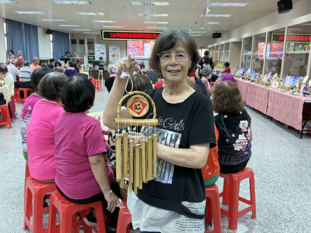 大安區農會舉辦綠色照顧推動示範計畫成果展,長輩展示自已課程作品風鈴之美外,還齊聚茶道品嚐、全體長輩也展現歌舞所學,會場氣氛熱鬧溫馨。(記者陳榮昌攝)