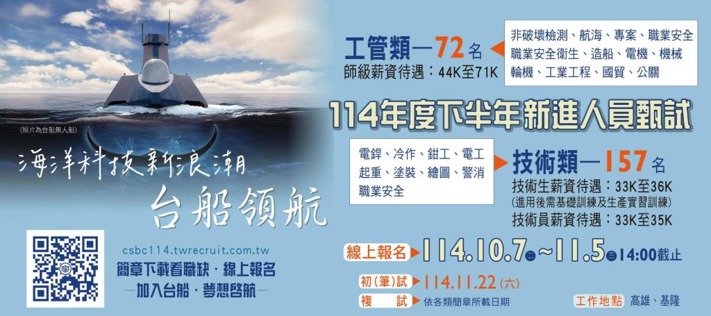 本次招考總計釋出工管類72名、技術類157名職缺,涵蓋從設計研發到現場製造的關鍵崗位。台船公司誠摯邀請有志於投入國防、綠能、以及智慧海洋科技的優秀人才踴躍報名,詳細招考職類、資格條件及薪資待遇等詳見本次甄試簡章及台船公司官網訊息。報名日期即日起至114年11月05日(三)14:00止,甄試報名網站:https://csbc114.twrecruit.com.tw