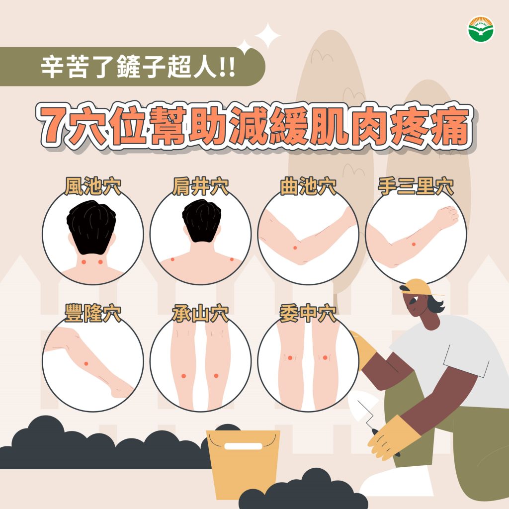 在減緩肌肉痠痛方面,可以自行穴位按摩放鬆筋骨,像是「風池穴、肩井穴、曲池穴、手三里穴、豐隆穴、承山穴、委中穴、敲膽經」;或是在醫師指引下,使用痠痛藥布或藥膏,減緩不適感。