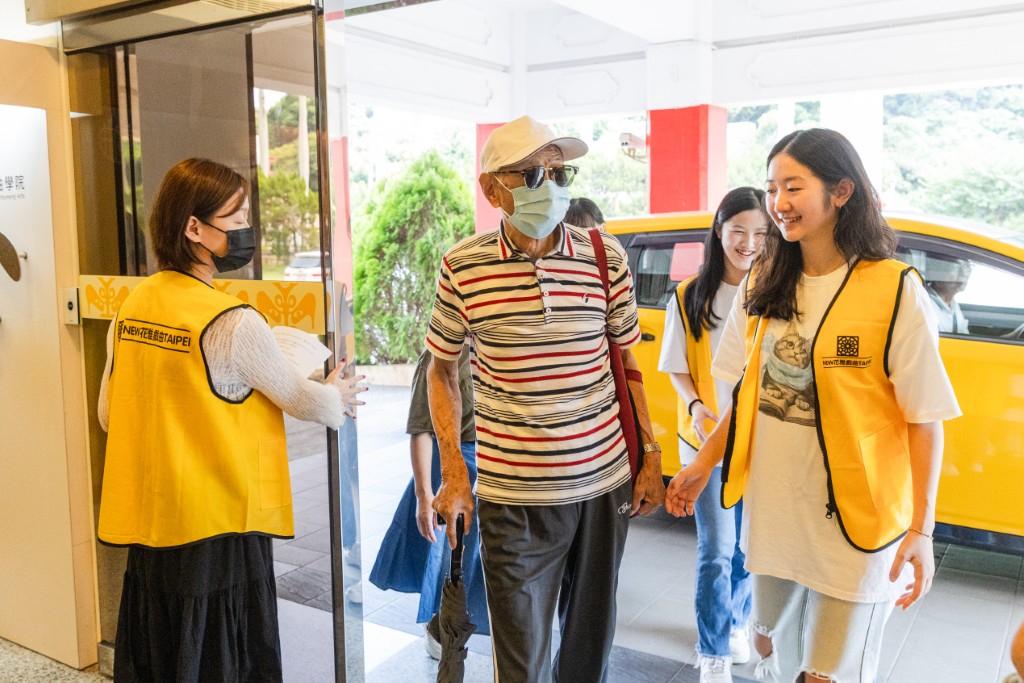 戲曲學院和國樂系青年學子在碧湖劇場外牽著長輩進入劇場內看戲。(新北市社會局提供)