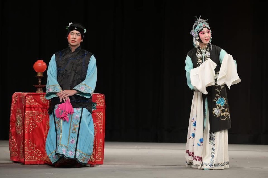 復興劇團優秀青年演員呂家男以青衣行當飾演春蘭(右) 面對婆婆的苛責倍覺委屈。(新北市社會局提供)