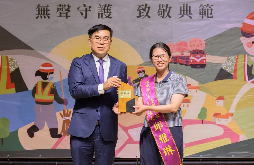 台中市清水區清潔隊長邱雅琳帶隊用心,榮獲全國模範隊長,接受環境部頒獎表揚。(記者陳金龍翻攝)