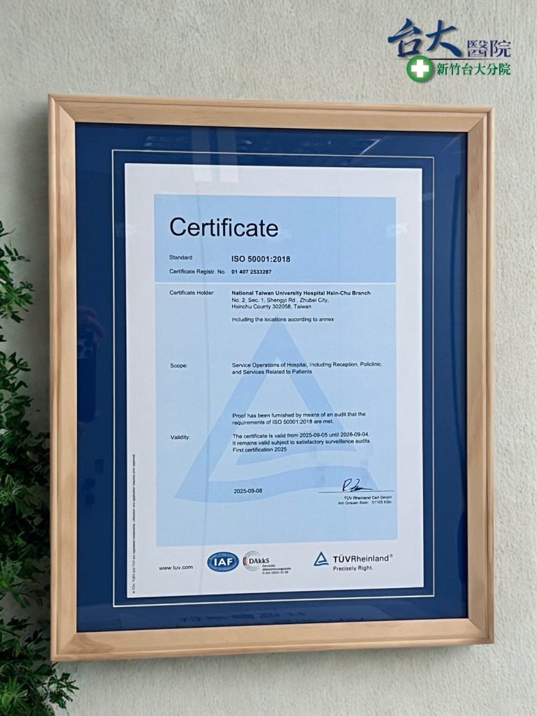 新竹臺大分院經國際專業第三方驗證機構驗證,正式取得ISO 50001:2018 能源管理系統認證,這項成就與已通過的 ISO 14064-1:2018 溫室氣體盤查認證相互呼應,象徵該院在低碳轉型與醫療節能領域再創新里程碑,更彰顯以雙認證落實永續承諾的堅定決心。