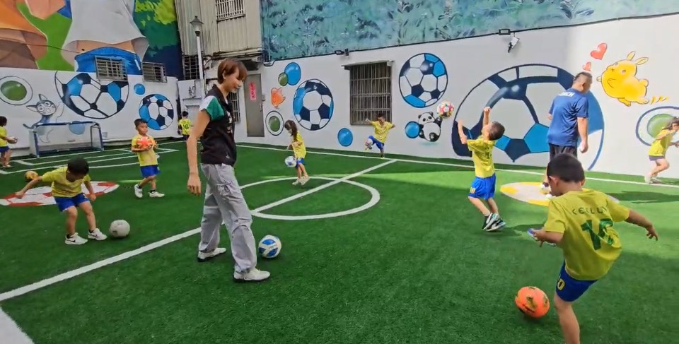 足球場上,請專業教練在一旁指導小朋友,做好基本動作,動作落實,小小足球員練習帶球射門,相當有成就感。家長說,這個轉角公園很不一樣,設計很漂亮,整個草坪很專業,不用再像以前要到海洋大學去人擠人,或找適合場地,鄰里公園能有此巧思真的很不錯。