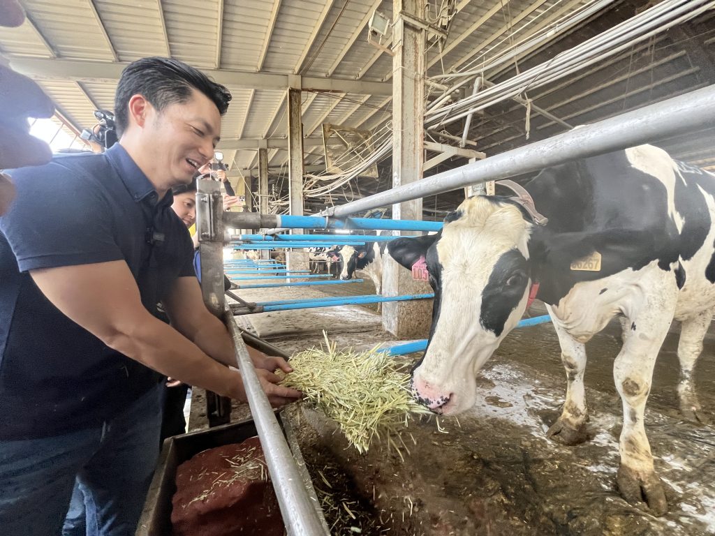 蔣萬安十六日上午在立委謝龍介陪同下,來到佳里梅桂牧場參觀,聽取業者甘智仁、沈月春介紹,了解自動化飼養與擠牛乳過程,現場也拿出草料餵食。蔣萬安說,台北市不只是消費者城市,也是支持者城市,他希望全台灣各縣市都和台北市一同來支持在地生產的鮮奶,還有農作物,支持食農教育、支持願意為這片土地努力付出的每一個人。