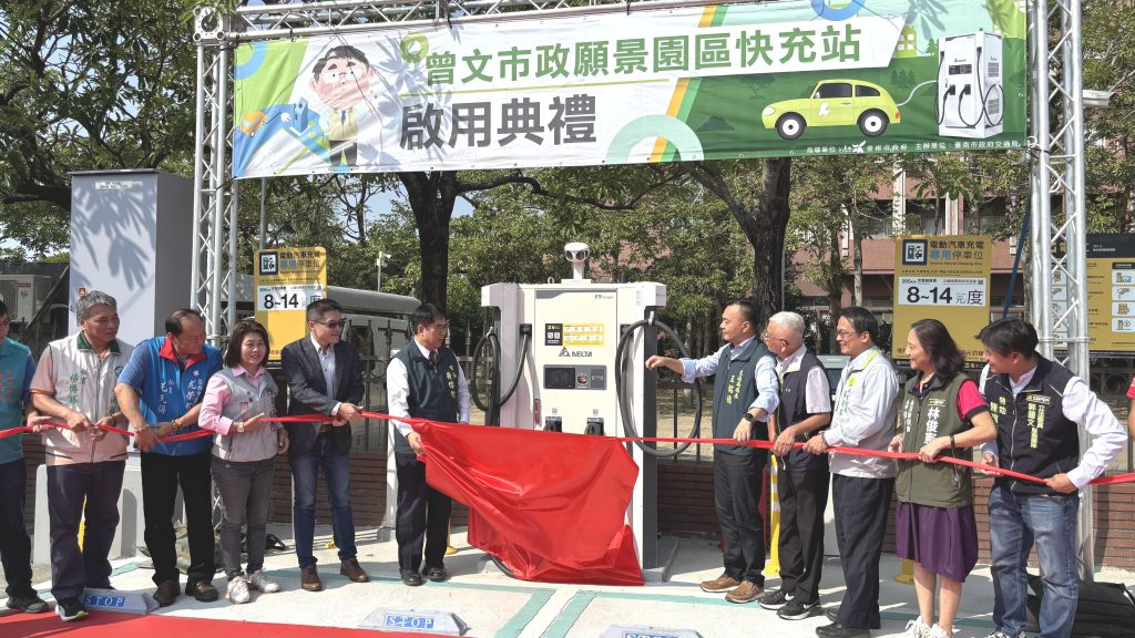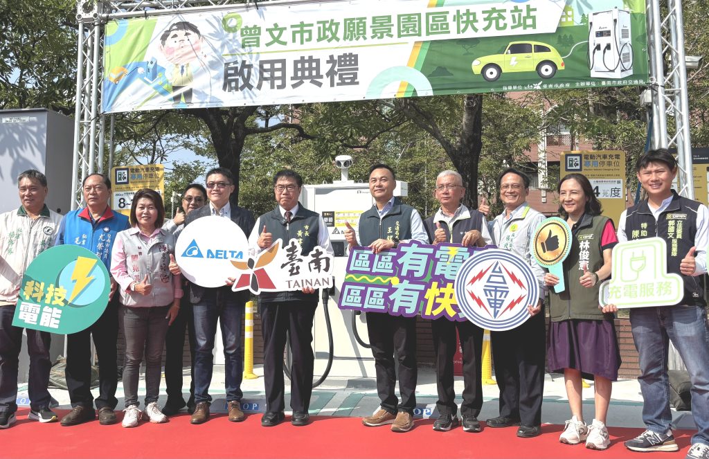 市長黃偉哲十六日於曾文願景園區主持電動車充電站啟用儀式,黃偉哲表示,年底前全市有一千席充電車位啟用、全國唯一區區有充電站、區區有快充站,減少車主的里程焦慮。