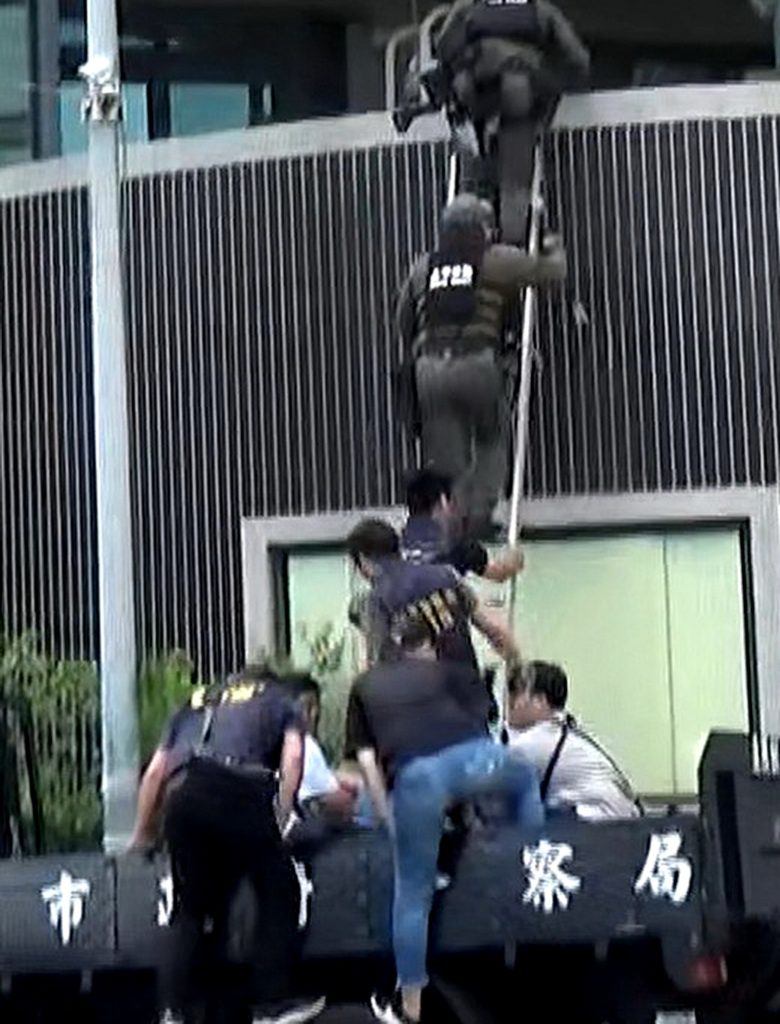 江姓男子涉博弈、暴力討債,檢警搭梯攻堅抓人。 (記者陳金龍翻攝)