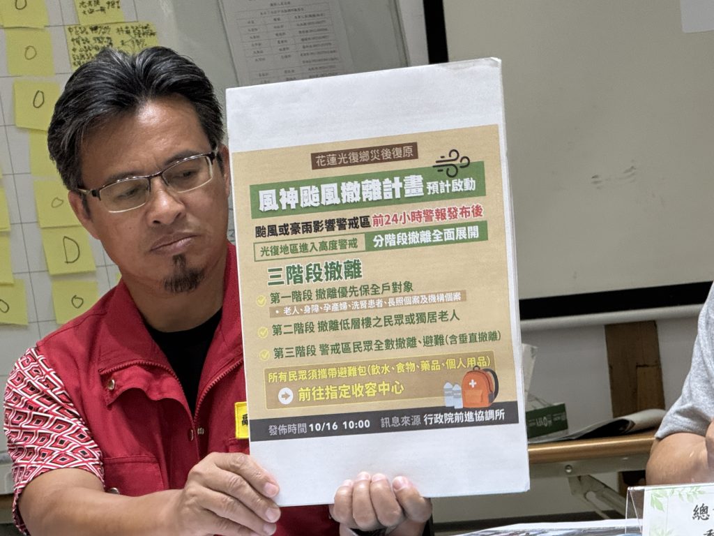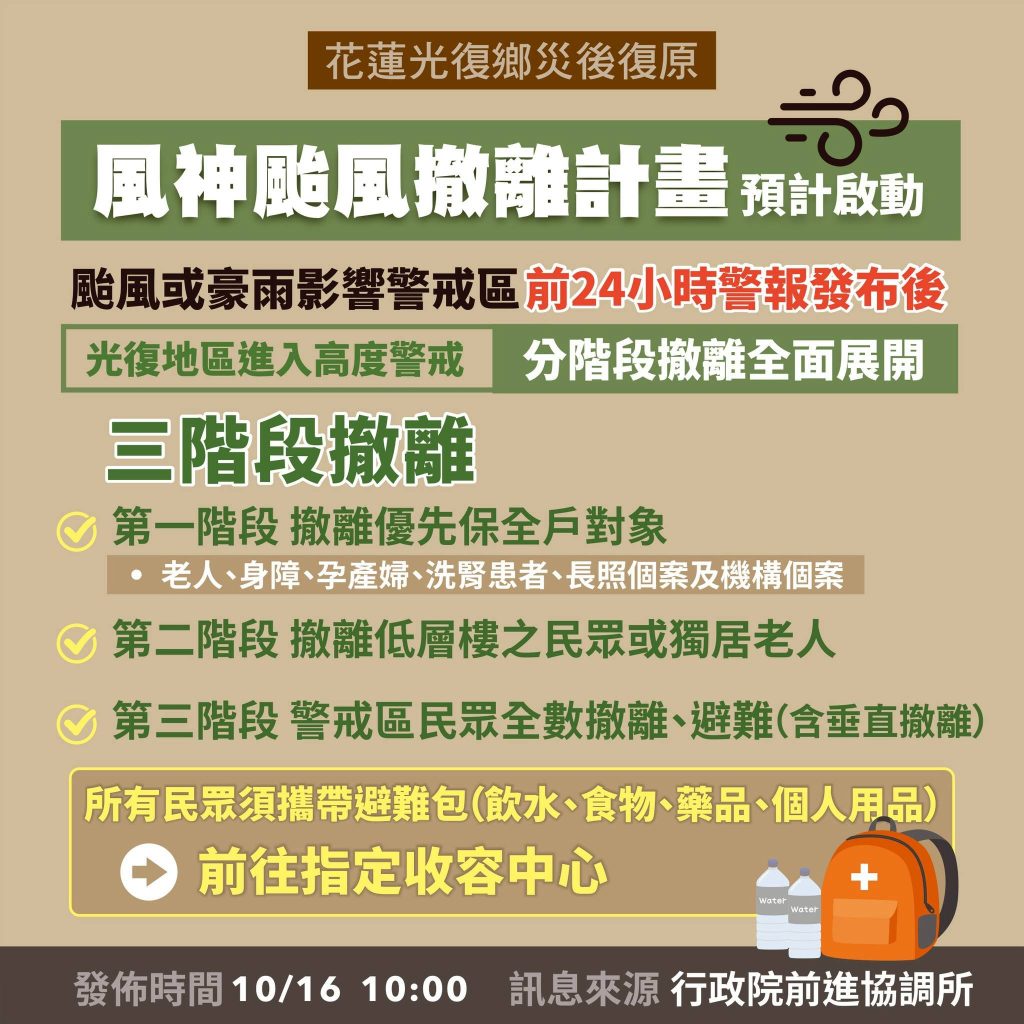因應颱風風神可能生成,中央前進協調所總協調官季連成十六日宣布,即日起三天是花蓮堰塞湖災區防颱大作戰,將視雨量、堤防水位監測資料,分三階段進行疏散、收容及垂直避難等強制撤離。另外為保持明確撤離規範,十八日起將禁止志工進入災區。