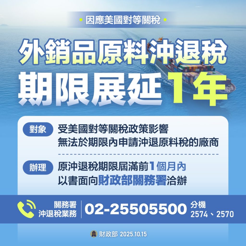 財政部於114年10月15日發布解釋令,釋明廠商因美國評估及實施「對等關稅」政策直接或間接影響其外銷出口,致無法於原料進口放行之翌日起1年6個月內申請沖退稅者,其沖退稅期限准予展延1年。