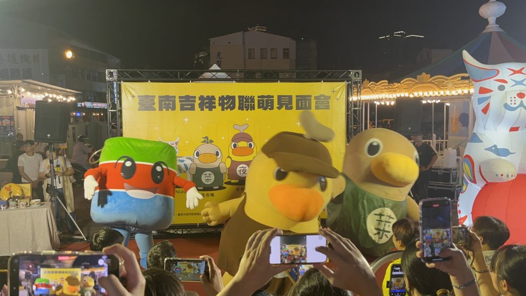 扮演台南城市行銷要角的公仔們組成臺南吉祥物聯萌,十七日晚間由高人氣的夜奇鴨領軍,與菜籃仔、魚頭君、巷仔Niau等吉祥物夥伴一起到北區武聖夜市與民眾相見歡,吸引無數迷哥迷姊和親子爭相拍照打卡,使得會場的氣氛熱鬧非凡。