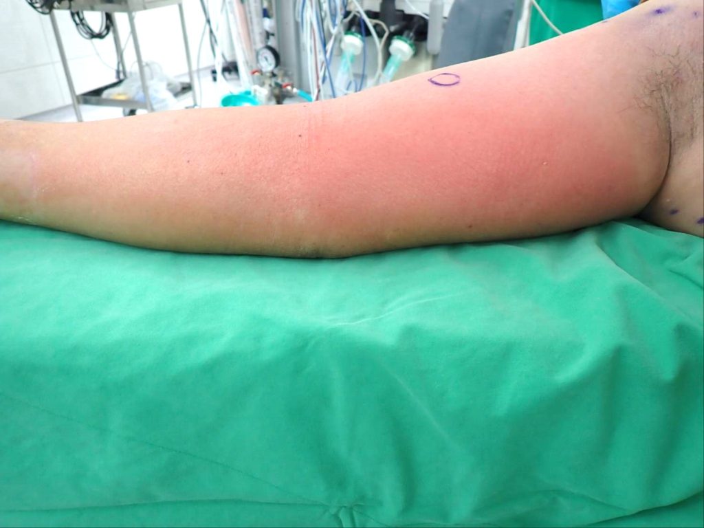 高雄秀傳骨科醫師王登冠說,患者自述被鹹水吳郭魚刺傷右手,接著出現畏寒和刺痛感,當晚凌晨因整隻右前臂紅腫而趕赴急診,隔天早上休克住進加護病房,確診是海洋弧菌引發「壞死性筋膜炎」,使用抗生素治療,但紅腫範圍仍持續擴散到肩膀處,因化膿程度嚴重且快速,醫師一度建議截肢保命。