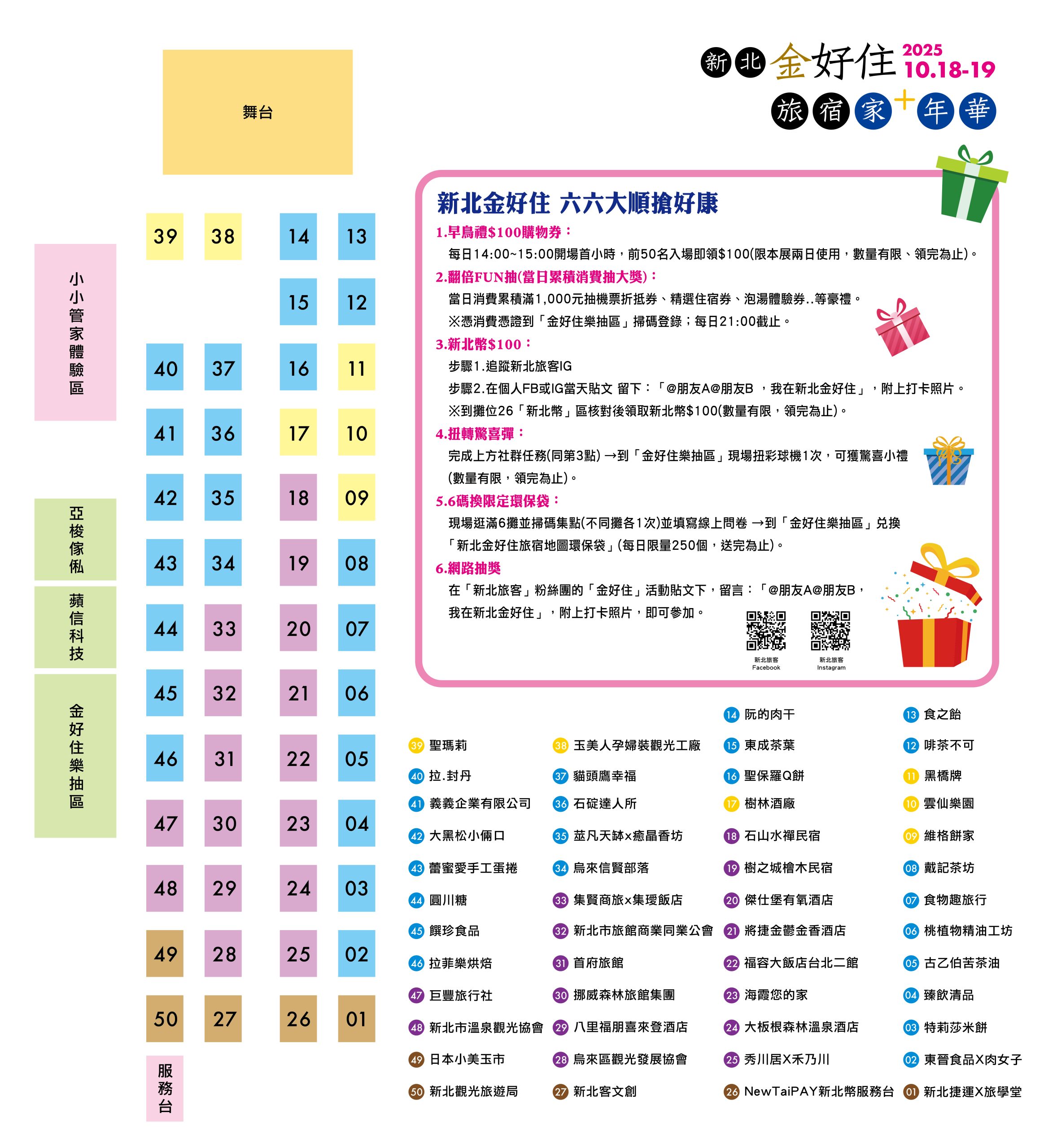 現場更設計「六六大順」全民參與體驗,包括:第一大順:「早鳥購物金」;每日開場首小時(14:00–15:00),前50名入場即贈$100購物券,鼓勵民眾提前報到、活絡買氣。 第二大順:「翻倍FUN抽」;單日消費滿1,000元可抽住宿、泡湯、機票折抵等多重豪禮。 第三大順:「新北幣互動任務」:完成指定打卡任務,即可至指定區兌換新北幣$100點數(等同現金使用)。 第四大順:扭轉驚喜彈;完成指定打卡任務,可扭彩球獲得住宿券、米餅、擂茶、DIY體驗券等精美好禮,驚喜感十足。 第五大順:「六碼連袋」;逛滿6攤、互動掃碼集點並填問卷,即可兌換限定版「旅宿地圖環保袋」,兼具永續精神與紀念價值。第六大順:「網路加碼抽」;線上完成指定貼文留言與好友標記,還有機會抽中多樣旅宿好康,延伸活動影響力至社群圈層。