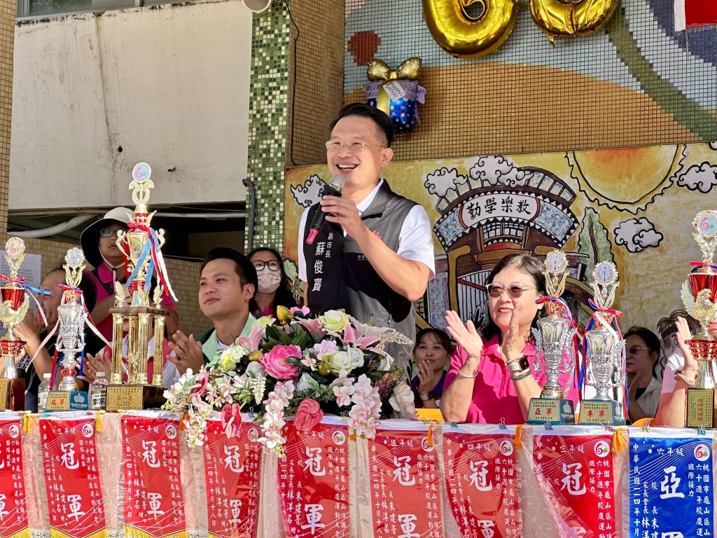 蘇俊賓致詞時特別跟現場師生分享「山頂」地名的由來,他表示山頂國小因山頂村為名,因地處龜崙山與桃園交界之高處而得名,雖然並非真正位於山頂,但六十年來深耕教育,無論在國語文競賽、閩南語教學、歌謠推廣、跆拳道及兒童繪畫比賽等領域,皆屢創佳績,充分展現學生多元學習成果與教師專業的付出。蘇俊賓也讚譽山頂國小是「龜山之頂、龜山首屈一指的優質學校」,並表示「山頂不只是地名,更象徵卓越與頂尖,是龜山的驕傲!」