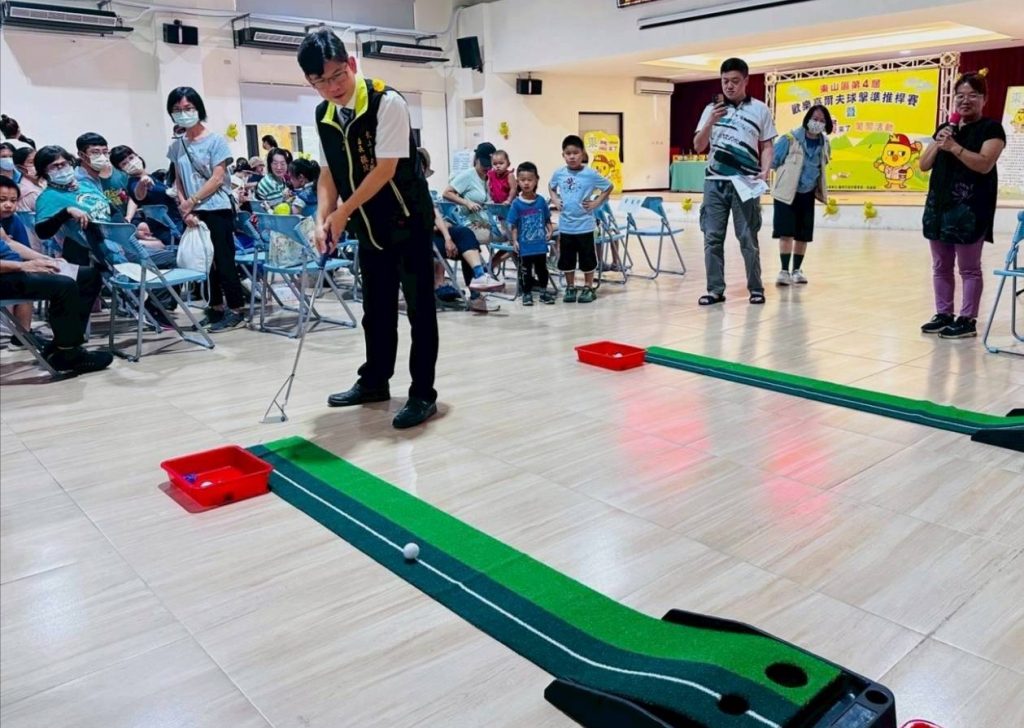 東山區公所十八日舉辦「歡樂高爾夫球擊準推桿賽」,並結合吉祥物「東桑來了」闖關活動,吸引不少民眾前來運動、闖關、集點、拿好禮,共度歡樂又活力滿滿的一天。