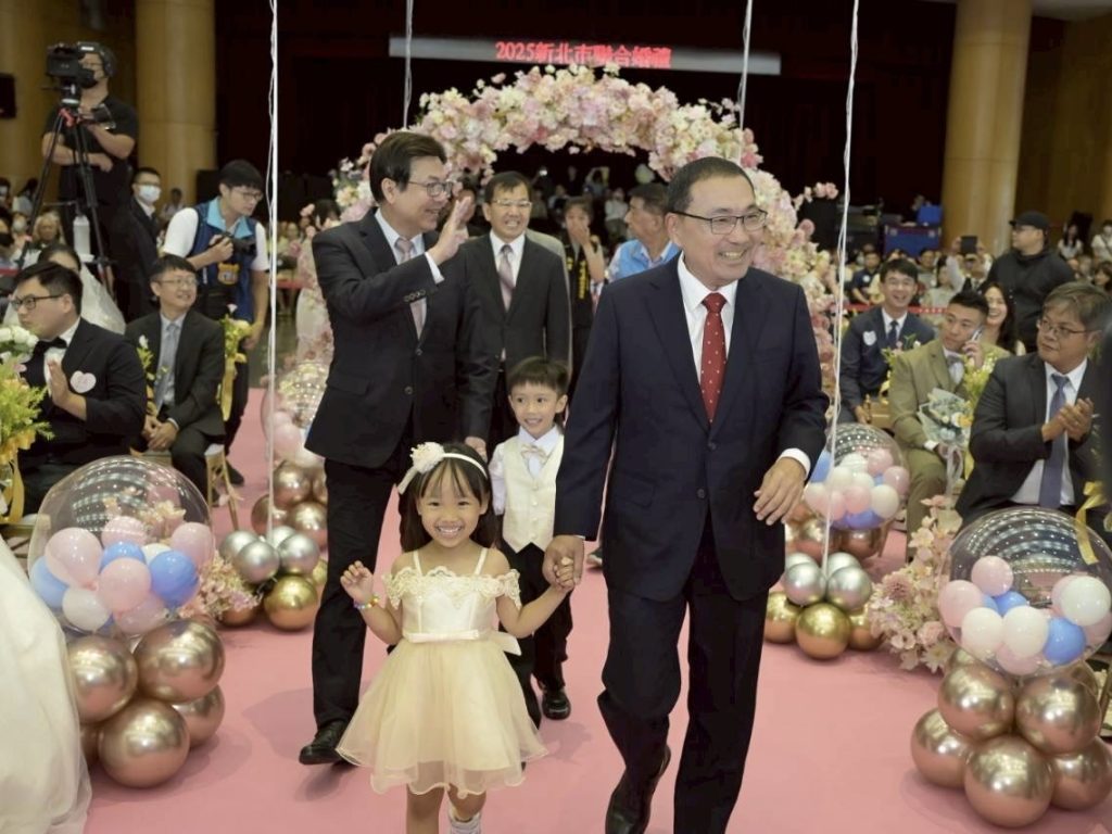 2025新北市聯合婚禮今(19)日於新北市政府浪漫登場,102對新人在市長侯友宜、副市長劉和然的見證下,互許終身、交換誓言,齊聲喊出「我願意!」,現場洋溢著滿滿幸福與祝福,溫馨氣氛瀰漫整個會場。