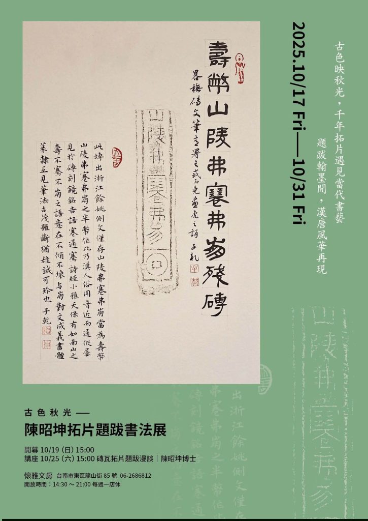 書法家陳昭坤以深厚的文史修養與書藝功力,將歷代拓片題跋轉化為當代書法的詩意展現。其個展「古色秋光──陳昭坤拓片題跋書法展」10月17日至10月31日在台南懷雅文房展出,呈現古意與秋光交融的墨韻世界。