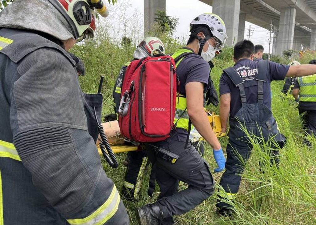 一名泰籍女子騎機車上國道四號,不名原因連人帶車從橋上墜落,消防人員到場搜尋在草叢找到女子,趕緊將她送醫急救。(記者陳金龍翻攝)