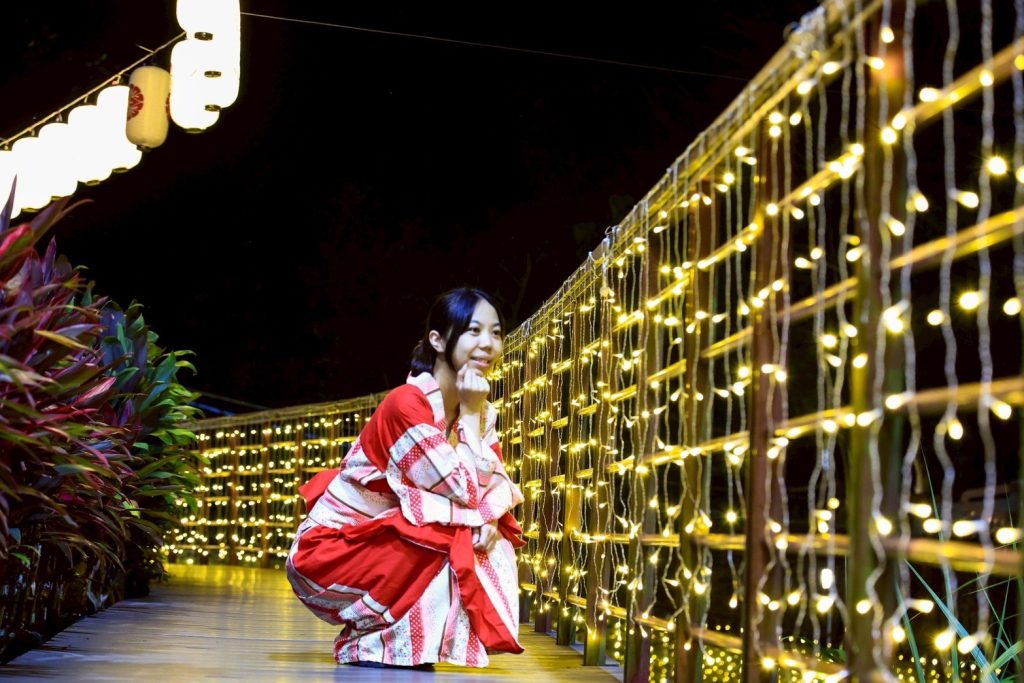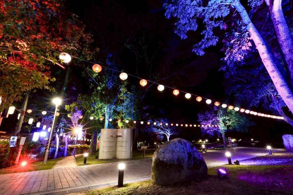 關子嶺溫泉美食節「嶺頂公園」的夜間燈飾為夜色增添繽紛光彩。(觀旅局提供)