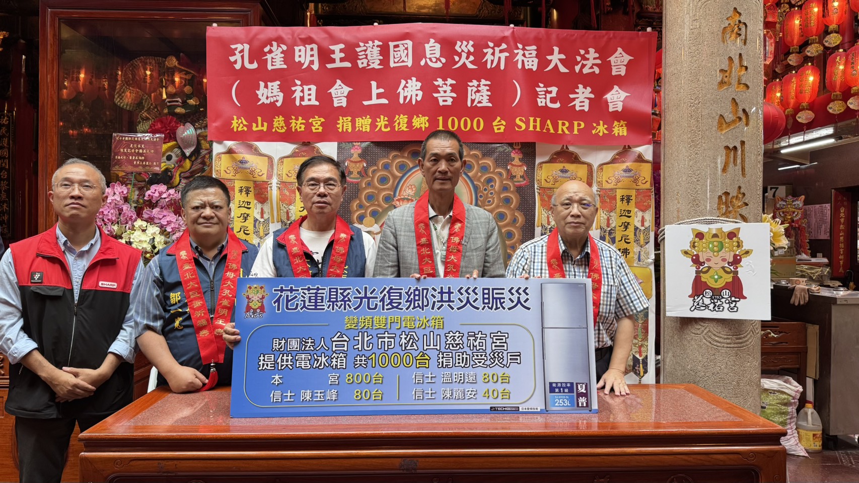 松山慈祐宮也盡一份心力,協助花蓮災後重建,目前正在募集約兩千台冰箱,希望能夠幫助受災地區的居民儘快恢復生活。這項善舉在大會會長蔡鴻祺師兄的熱心奔走下,已經陸續展開,蔡鴻祺董事長是花蓮「雲山水」渡假山莊的負責人,災後第一時間就親赴現場支援,展現極大的慈悲與行動力。慈祐宮先捐出一千兩百五十萬元作為災區救助基金,期盼能夠完成這兩千台冰箱的捐贈。此外,在農曆九月九日(國曆10月29日)媽祖昇天日當天,花蓮縣長徐榛蔚將蒞臨慈祐宮受贈代表接收這批物資,繼續把媽祖慈悲的精神傳遞到花蓮。