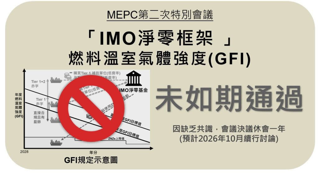 然而本次會議自首日即因美國與沙烏地阿拉伯等國對「IMO淨零框架」採納程序及內容提出強烈反對,歷經多日協商仍未能形成共識。最終,沙烏地阿拉伯提出休會一年的臨時動議,並經表決獲得多數支持後,會議遂決議休會一年(預計2026年10月續行討論),此結果意味著「IMO淨零框架」未能依原定時程獲得採納通過。