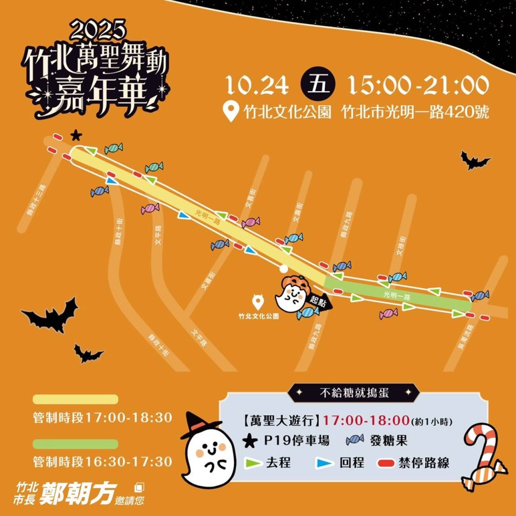 萬聖節重頭戲「萬聖變裝大遊行」將於當日下午五點展開,由市長鄭朝方領隊,從竹北文化公園出發,沿光明一路、文化局、吳濁流路、文祿街、縣政九街、文喜街、文信街一路走街,最後折返至文化公園,全程約一點五小時。遊行期間將進行交通管制,提醒民眾提前改道,造成不便敬請見諒。