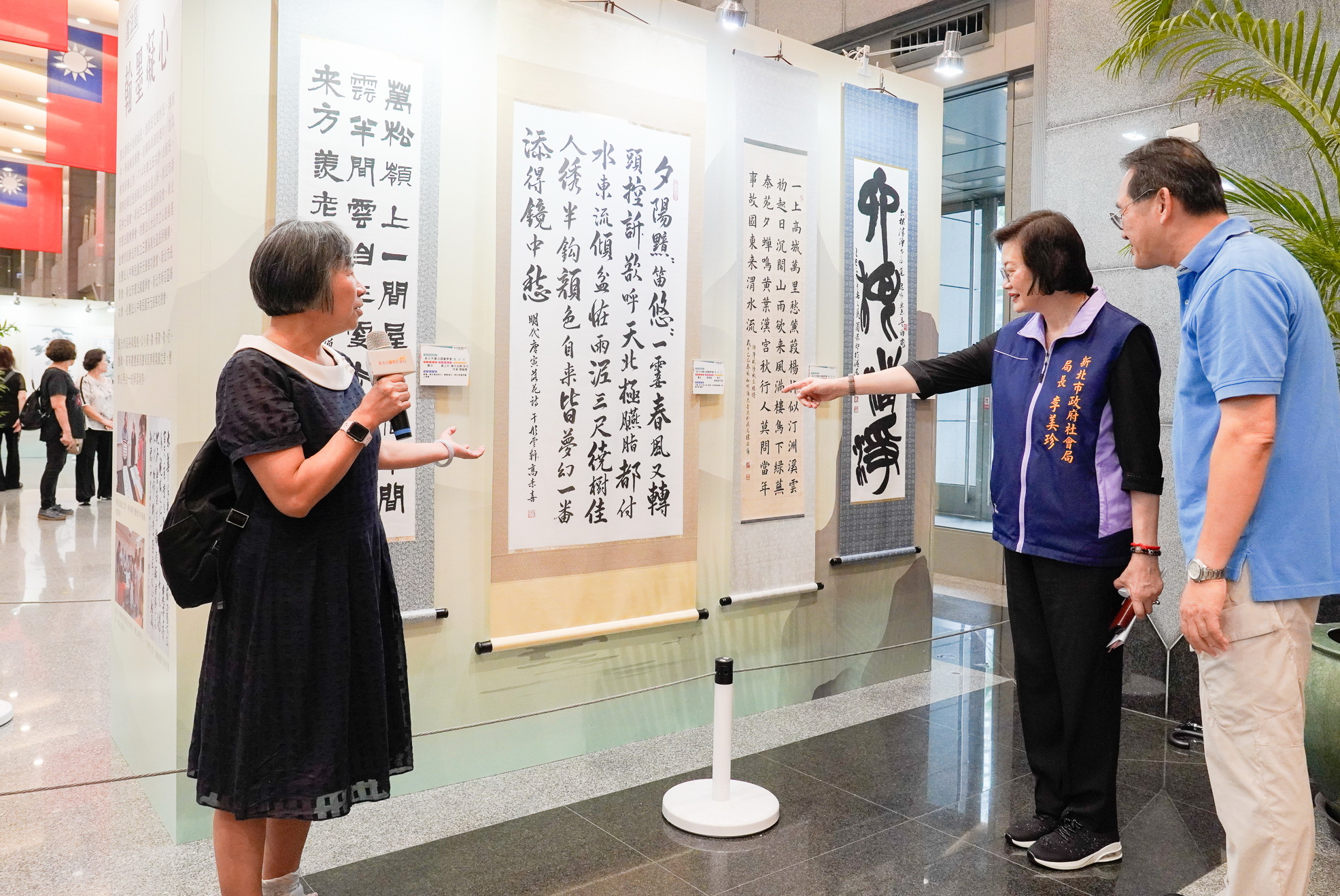 一一四年新北市松年大學靜態成果展二十日在市府一樓大廳登場,以「世代同學、青春不老」為主題,展期至十月廿四日止,展出作品多達九十五件,從書法、國畫、山水畫到禪繞畫、粉彩畫與彩繪文創設計,琳瑯滿目、創意十足,讓人難以想像這些都是銀髮學員的巧手之作。