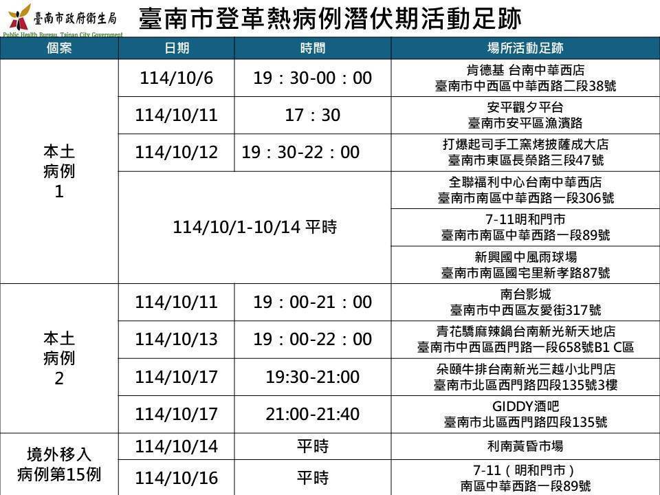 南市府衛生局疫調發現,南市登革熱本土首例自六月廿二起自菲律賓來台工作,迄今未返回母國,十月十五日出現背痛、關節痛等症狀,十六日自行服藥症狀未改善並出現發燒、出疹症狀。後至醫院治療並經快篩陽性,於十七日通報。南市登防中心獲報於十八至廿日針對接觸者擴大採血一七四人,十八日發現同部門的本國籍員工檢出PCR陽性,該案同日晚間出現發燒及關節、肌肉疼痛症狀。