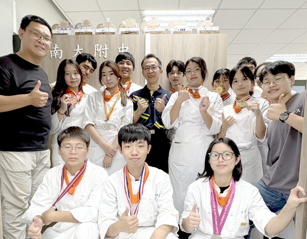 台南大學附屬高中餐飲技術學程學生團隊結合理論與實務,在二0二五台南美食之都國際餐飲藝術挑戰賽中,展現創意與精湛技藝,包括異國料理、手指小食組等狂掃三金、八銀、四銅共計十五個獎項,展現南大附中培育餐飲人才的卓越成果。